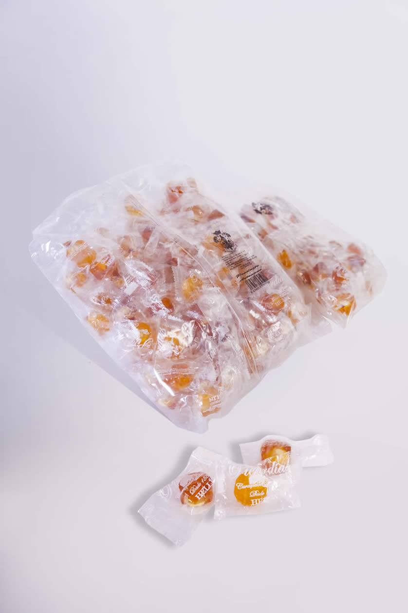 Azúcar tostado con relleno de avellana. Presentación bolsas de 1 kg. 250 grs. 75 uds/kg.